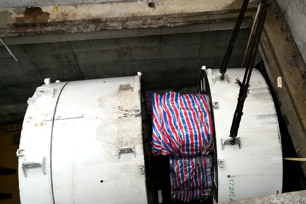 軌道交通4號(hào)線首臺(tái)盾構(gòu)機(jī)“奮斗一號(hào)”順利吊裝下井