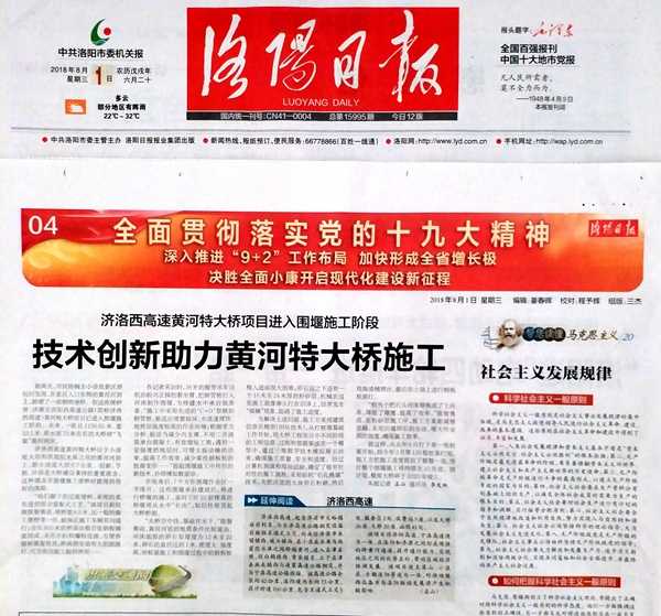 8月1日,《洛陽日?qǐng)?bào)》04版刊發(fā)文章《技術(shù)創(chuàng)新助力黃河特大橋施工》,對(duì)公司黃河特大橋項(xiàng)目技術(shù)創(chuàng)新進(jìn)行了報(bào)道。