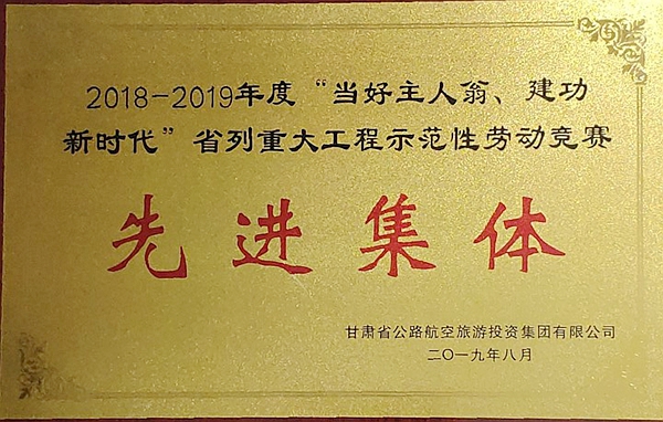 因在甘肅省公航旅集團(tuán)開展的2018-2019年度“當(dāng)好主人翁、建功新時(shí)代”省列重大工程示范性勞動(dòng)競(jìng)賽活動(dòng)中表現(xiàn)優(yōu)異,11月17日,銀百高速TY14標(biāo)被授予“先進(jìn)集體”稱號(hào),項(xiàng)目負(fù)責(zé)人同時(shí)榮獲“優(yōu)秀項(xiàng)目經(jīng)理”稱號(hào)。