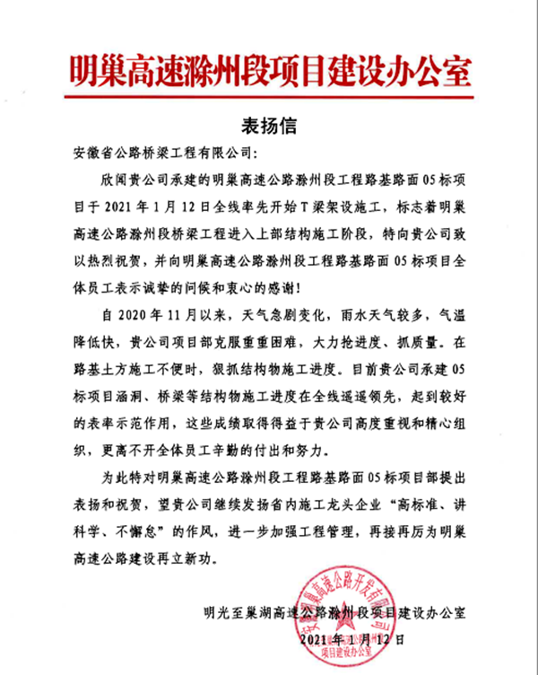 1月12日,明巢高速滁州段項目辦給公司來信,對公司承建的明巢高速05標在全線率先開始T梁架設(shè)進行表揚。