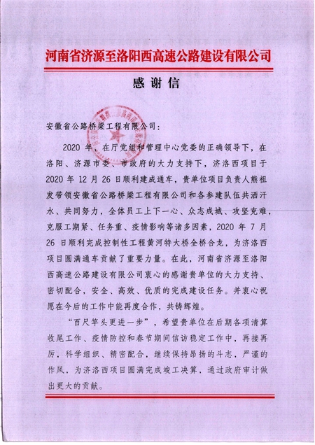 近日,公司承建的黃河特大橋項(xiàng)目收到業(yè)主發(fā)來(lái)的感謝信,對(duì)項(xiàng)目安全、高效、優(yōu)質(zhì)的完成建設(shè)任務(wù)表示感謝。同時(shí),該項(xiàng)目在業(yè)主組織的2020年度先進(jìn)集體評(píng)選中,被授予“突出貢獻(xiàn)”先進(jìn)集體稱號(hào)。