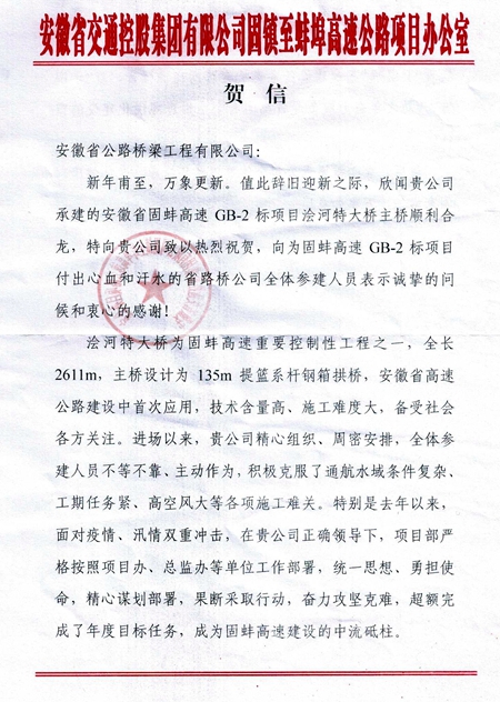 固蚌高速2標(biāo)項目收到業(yè)主賀信