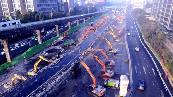 2020年12月4日22時,項目封閉施工,正式吹響大干的號角。26天后,首根墩柱順利澆筑。2月3日,30臺大型破碎機組成“鋼鐵戰(zhàn)隊”,僅用15個小時便完成了原計劃兩天才能完成的匝道拆除任務。3月25日,經(jīng)過35天的持續(xù)奮戰(zhàn),主線橋第四聯(lián)順利架設,提前拉開了上部結構施工的序幕。