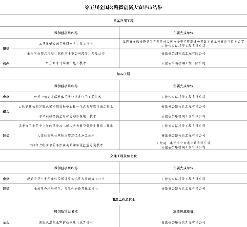 近日,中國公路學會公布了第五屆全國公路微創(chuàng)新大賽評審結果,公司《一種用于鋼殼索塔整體吊裝快速定位的工藝技術》《采用可拆卸式定型化挖機挖斗施工路堤、路塹邊溝》《中分帶無污染填土施工技術》等十余項微創(chuàng)新成果在眾多參賽項目中脫穎而出,分別榮獲金獎、銀獎、銅獎。