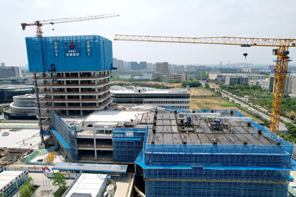 桃花科創(chuàng)產(chǎn)業(yè)園項(xiàng)目二期共有4棟商業(yè)辦公樓及1棟單層商業(yè)樓。為更加高質(zhì)高效推進(jìn)工程進(jìn)度,項(xiàng)目部持續(xù)優(yōu)化模板搭設(shè)、鋼筋綁扎、混凝土澆筑等全流程施工工藝,注重應(yīng)用高層混凝土泵送、勁性鋼柱、附著式升降腳手架、智能布料機(jī)等新技術(shù),施工效率和安全性進(jìn)一步提升。