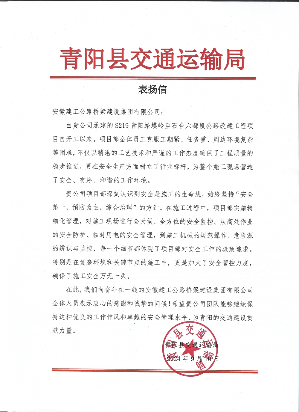 青陽(yáng)縣交通運(yùn)輸局來(lái)信表示,青陽(yáng)S219改建項(xiàng)目自開(kāi)工以來(lái),不斷克服工期緊、任務(wù)重、周邊環(huán)境復(fù)雜等困難,始終堅(jiān)持“安全第一,預(yù)防為主,綜合治理”的方針,安全穩(wěn)步推動(dòng)項(xiàng)目建設(shè),在安全生產(chǎn)方面樹(shù)立了標(biāo)桿。