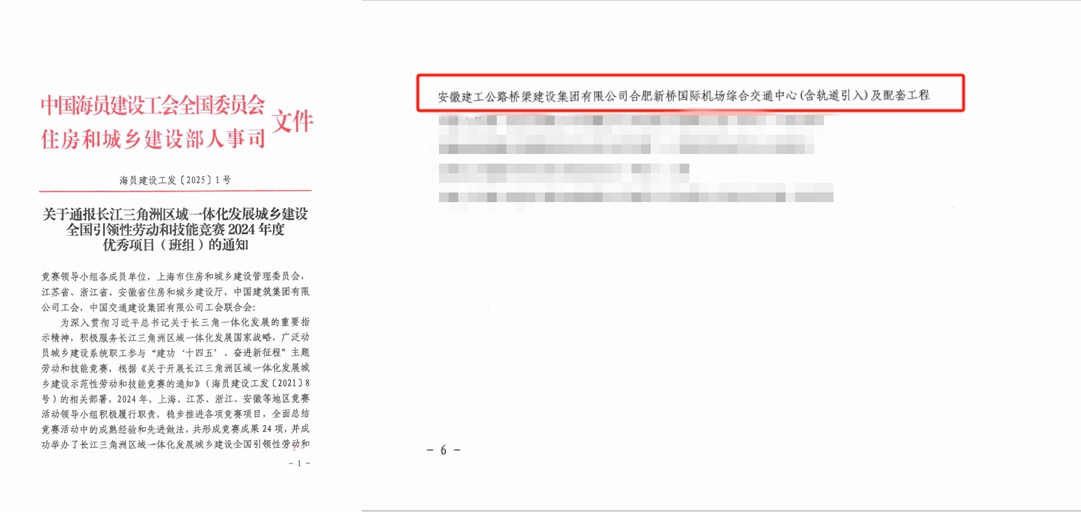 合肥新橋國際機(jī)場綜合交通中心項(xiàng)目榮獲長江三角洲區(qū)域一體化發(fā)展城鄉(xiāng)建設(shè)全國引領(lǐng)性勞動(dòng)和技能競賽2024年度優(yōu)秀項(xiàng)目