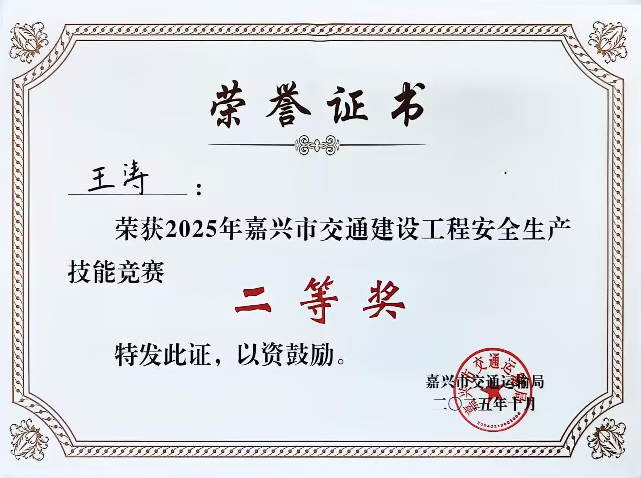 10月30日,由嘉興市總工會(huì)、嘉興市交通運(yùn)輸局聯(lián)合舉辦的2025年嘉興市交通建設(shè)工程安全生產(chǎn)技能競(jìng)賽,在浙江分公司524國(guó)道TJ01標(biāo)項(xiàng)目圓滿(mǎn)舉行。項(xiàng)目精心選派的參賽選手王濤憑借出色發(fā)揮,榮獲二等獎(jiǎng)。