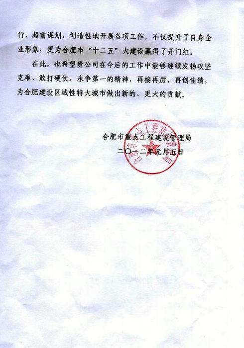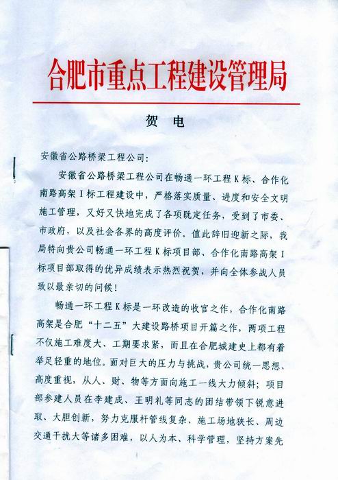 合肥市重點局發(fā)賀電對公司在市政建設(shè)中的優(yōu)異成績表示祝賀