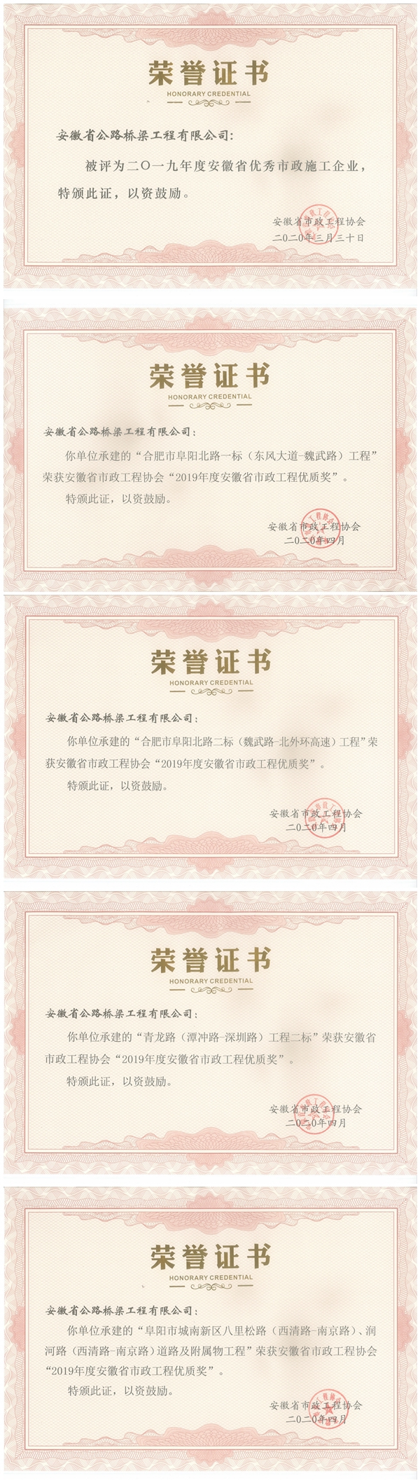 近日,安徽省市政工程協(xié)會發(fā)布2019年度安徽省優(yōu)質(zhì)工程獎評選結(jié)果和2019年度安徽省優(yōu)秀市政施工企業(yè)。阜陽北路高架北延一標、二標,阜陽八里松路項目、青龍路工程二標等項目被授予“2019年度安徽省市政工程優(yōu)質(zhì)獎”,公司再次榮獲“2019年度安徽省優(yōu)秀市政施工企業(yè)”稱號。