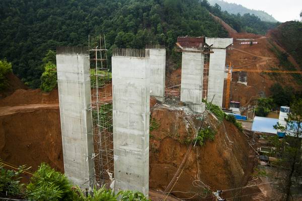 蘆灣一橋的3、4號墩,是空心薄壁墩,而且還是水中樁;蘆灣二橋的4、6號墩,地處縣崖峭壁、地形復(fù)雜,再加上空心薄壁墩每天平均只有施工